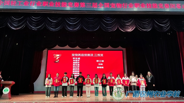 2023年12月2日,在柳州市举行的,由中国轻工业联合会、中国财贸轻纺烟草工会全国委员会、中国礼仪休闲用品工业协会主办;广西农牧工程学校承办;2023年全国轻工行业职业技能竞赛—第三届全国宠物行业职业技能竞赛“顽皮杯”广西赛区预选赛之宠物美容师赛项圆满落下帷幕。现代农业学部王静、莫志莲老师分别指导的宠物221班滕嘉静、施明珍二位同学在该赛项中喜获三等奖;王静、莫志莲二位老师荣获“优秀指导教师”称号。