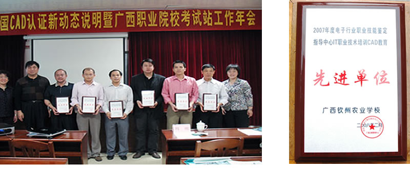 该年会目的是总结2007年的工作,推广2008年CAD项目新增的电子CAD、三维机械CAD的培训考试,明确今年各考试站培训认证任务,并对获得2007年度电子行业职业技能鉴定指导中心IT职业技术培训CAD教育“全国先进单位”、“全国先进个人”和广西区域“优秀考试站”荣誉称号的学校代表进行表彰。我校获得了“全国先进单位”、何祖猛老师获得“全国先进个人”的荣誉称号。