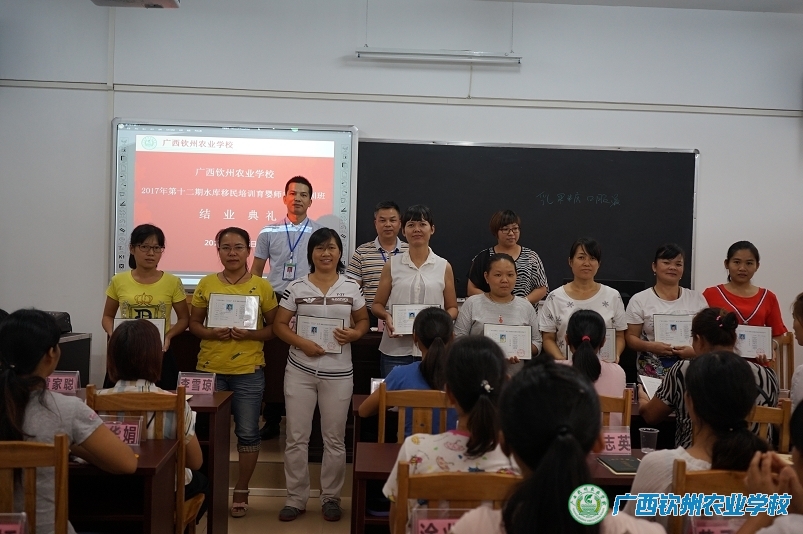 9月25日下午,我校2017年第十二期水库移民就业技能育婴师培训班结业典礼在学校培训教室隆重举行,副校长邓喜和、灵山县水库移民工作管理局领队杨雪梅出席结业典礼。