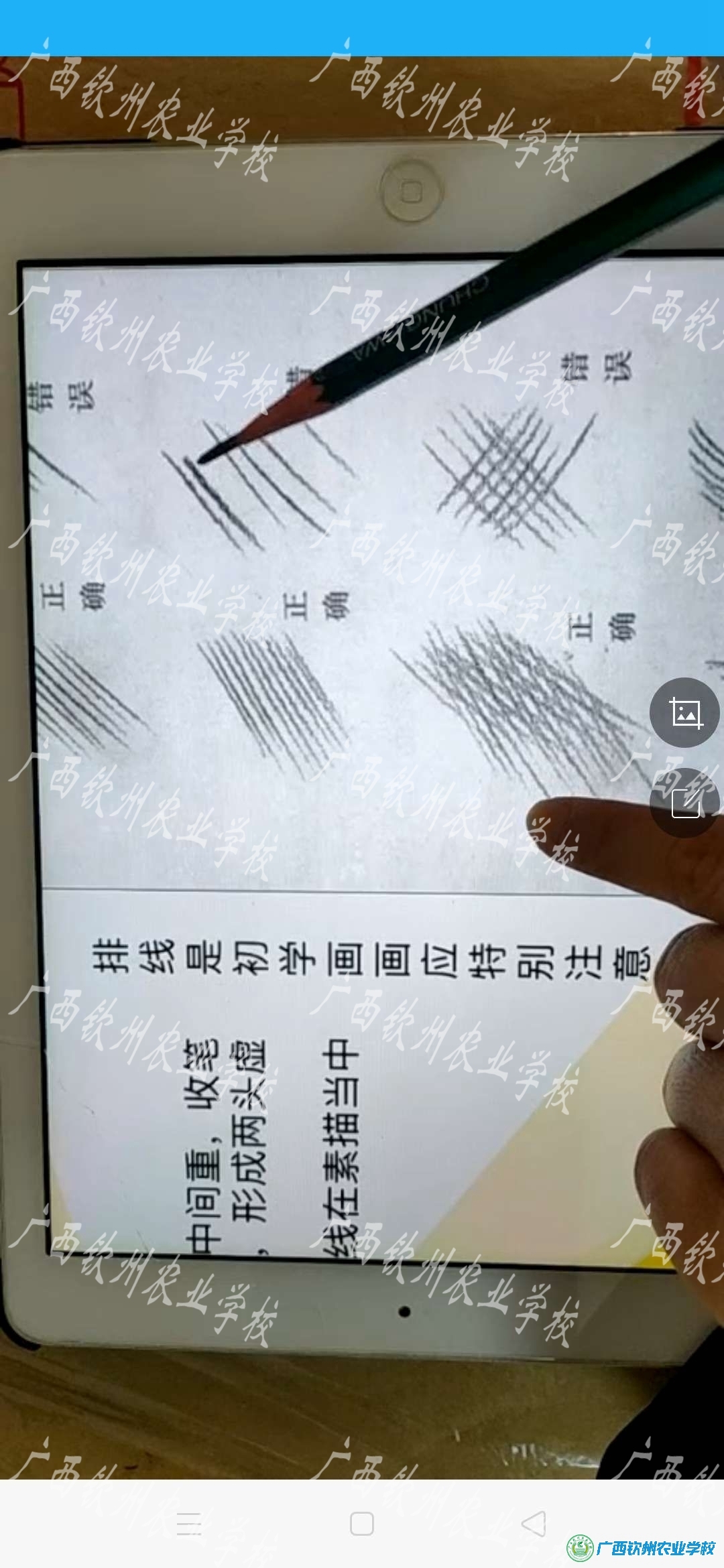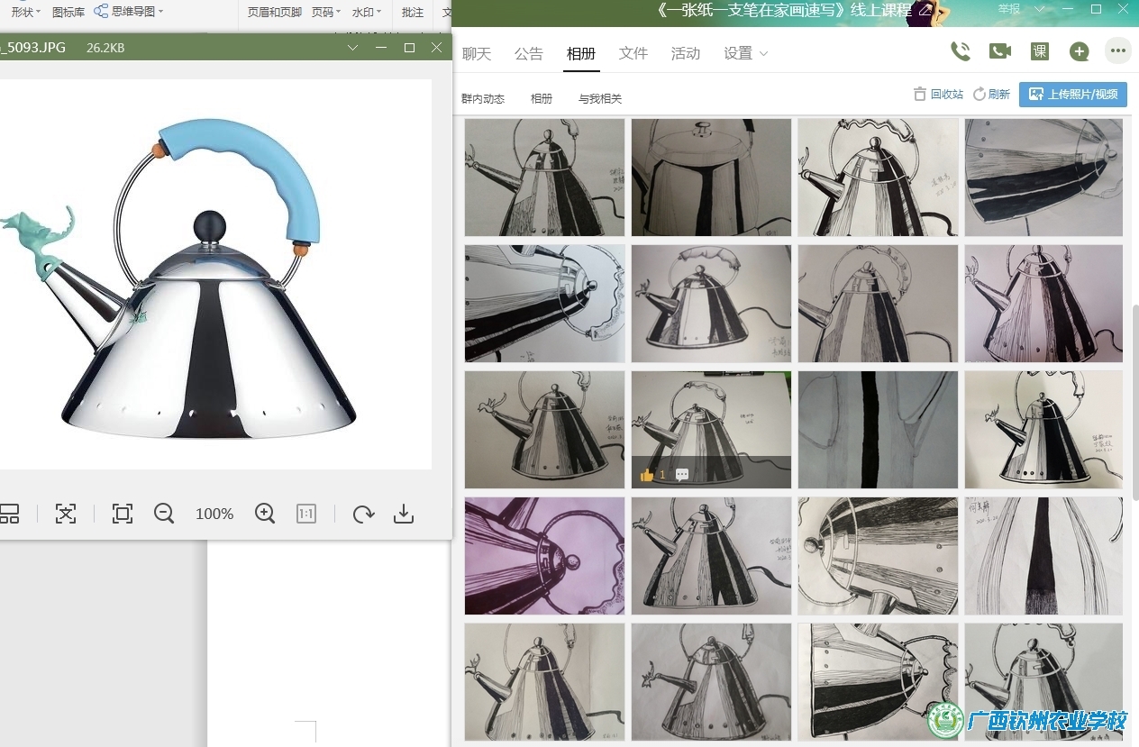 袁晓慧的《素描》直播课堂,是学前191、学前192班,一共96人,利用演示直播、从如何抓笔、绘画工具工具介绍、排线开始,她指导学生通过直播、案例的方式进行,学生按部在老师的直播、Q群指导下联系作业、打好基本功。