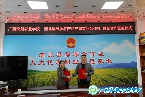 3月21日,我校党委委员、副校长邓业斌与浦北县绿源农产品产销专业合作社理事长李燕萍在浦北县福旺镇正式签署校企合作协议。
