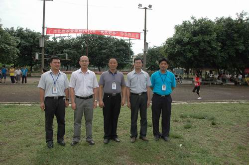 主持全面工作的伍国樑副校长(中)等领导与代代好梁副经理(左二)亲临比赛现场指导