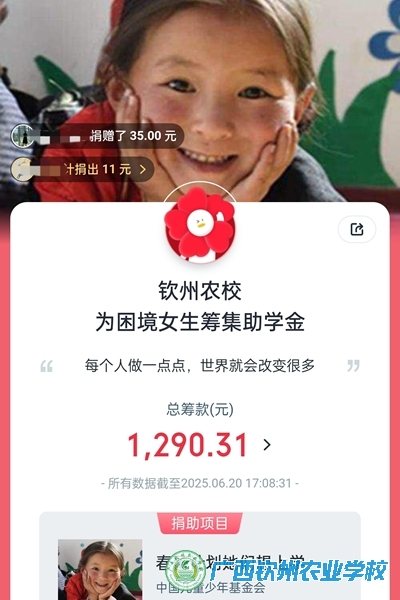 “春蕾计划”是由中国儿童少年基金会发起的爱心项目,致力于帮助困境家庭女童改善受教育状况。为响应钦州市妇联号召,助力公益事业,奉献一份爱心。学校工会和妇委会近日向全校师生发起“为爱一起捐”活动倡议。截至活动结束时,我校师生共计捐款1290.31元,以实际行动助力钦州春蕾女童求学圆梦。