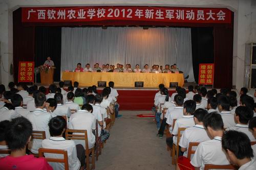 9月21日,我校2012级新生军训动员会在学校大礼堂隆重召开,学校领导和武警钦州市边防支队领导、教官在主席台就座,2012级全体新生、班主任参加了大会。