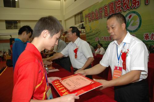 闭幕式上,进行了九轮颁奖:广西钦州农业学校囊括了本届运动会所有项目,即乒乓球男子和女子单打、乒乓球男子和女子团体、气排球男子和女子团体的冠军;广西桂林农业学校、河池民族农业学校获得体育道德风尚奖;钟玉莹(广西玉林农业学校)等4人获得“优秀运动员”称号;黎雄飞(广西农业职业技术学院)等8人获得“优秀教练员”称号。获得乒乓球男子团体亚军、季军的分别是广西农业职业技术学院、广西百色农业学校;获得乒乓球女子团体亚军、季军的分别是广西百色农业学校、广西农业职业技术学院;获得气排球男子团体亚军、季军的分别是广西梧州农业学校、广西玉林农业学校;获得气排球女子团体亚军、季军的分别是广西百色农业学校、广西玉林农业学校。出席闭幕式的领导、嘉宾为获奖运动队、运动员颁奖。
