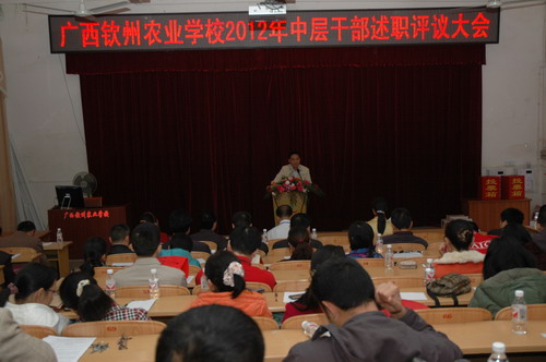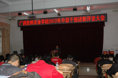 根据《广西壮族自治区事业单位工作人员考核实施办法》,为落实对干部队伍考核工作的要求,进一步加强中层干部考核管理监督机制,促进干部队伍的健康发展,强化干部队伍建设,我校于2012年12月21日下午在电化教室召开中层以上领导干部述职报告会,会议由覃一静副校长主持。会上,学校中层领导干部向教职工进行了年度工作述职,全校教职工对他们的工作业绩进行了民主评议,并进行了年度考核优秀名单的推荐。