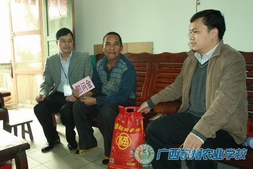 覃效敏副校长(左)、周家立副校长(右)向吴秉钦送慰问金和慰问品
