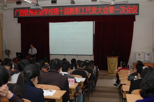 21日上午,在雄壮的国歌声中举行了开幕式,并召开全体会议,会议由工会陆武昌主席主持。覃一静副校长致开幕词,受大会主席团委托,伍国樑校长作了《广西钦州农业学校关于开展发展提升年活动的报告》、周家立副校长作了《2012年学校经费决算和2013年学校经费预算》的报告、覃效敏副校长作了《面对招生困难局面,学校应采取哪些切实可行的措施?》等五个议题的报告。