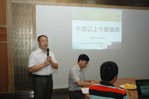 4月26日,我校中层以上领导干部26人到钦台农农业综合观光休闲有限公司,联合举办钦州农校和钦台农中层干部培训,落实《2013年—2017年广西干部教育培训规划》,进一步提高学校中层干部的综合素质,更好地为教育教学服务,也促进了校企合作,联合办学的发展。